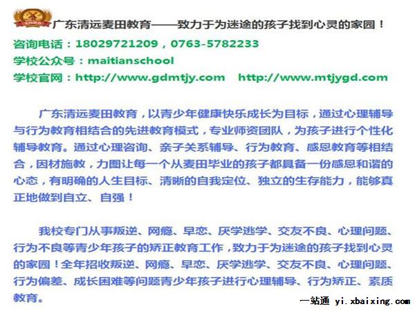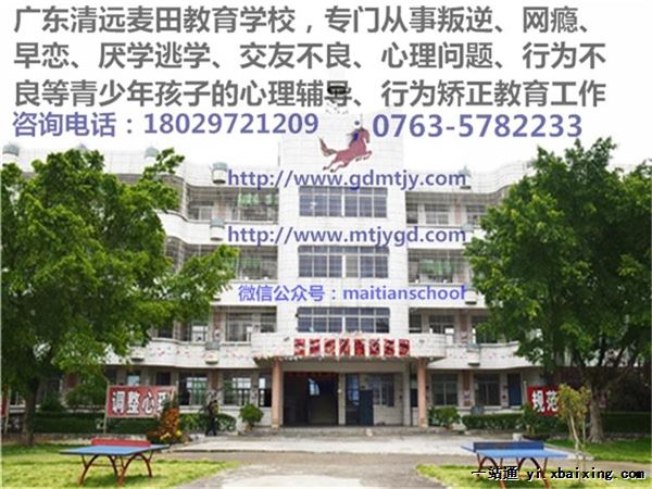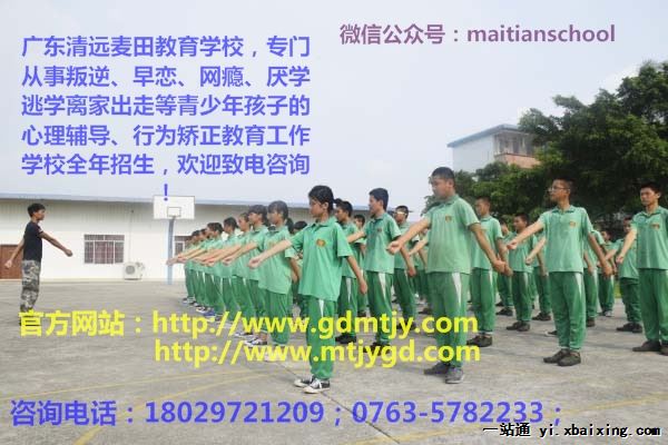 广东清远麦田教育学校,专门从事叛逆、网瘾、早恋、厌学逃学、交友不良、心理问题、行为不良等青少年孩子的心理辅导、行为矫正教育工作的全封闭式教育学校,致力于为更多迷途的孩子找到心灵的家园!全年招生,随时入学,欢迎致电咨询或来校参观!
